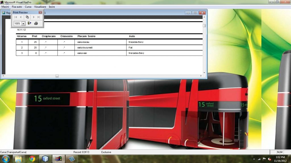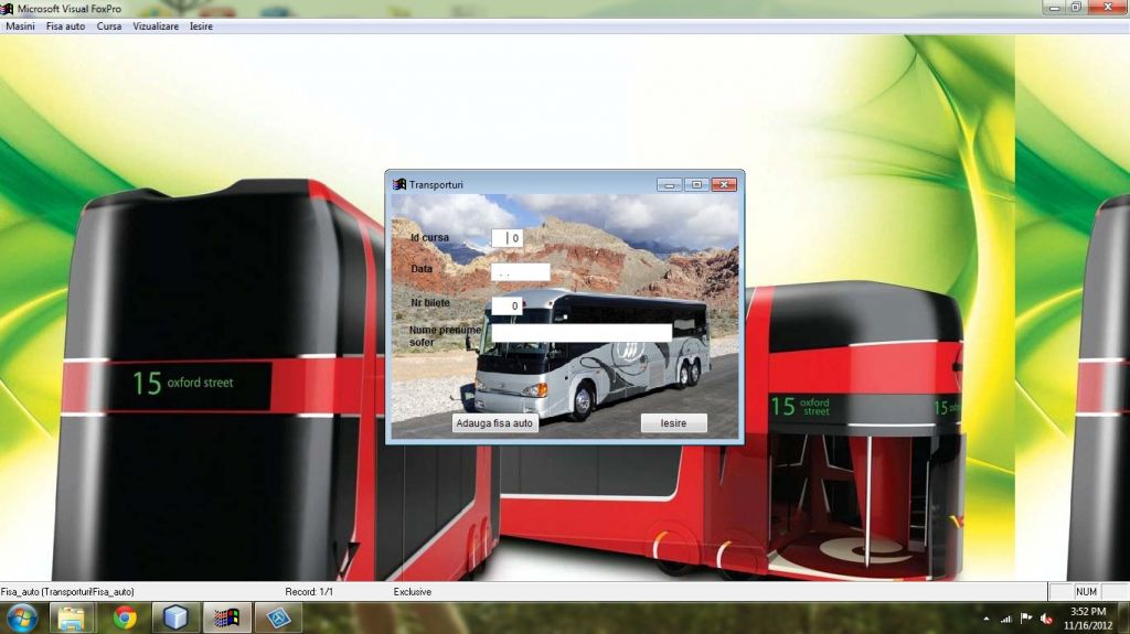 Aplicatia este utila intr-o firma de transport deoarece interfata ei prietenoasa cu utilizatorul permite gestionarea intr-un mod rapid si eficient a masinilor, a soferilor precum si a curselor efectuate.Atestatul vine insotit de documentatie in word cu explicatiile legate de functionalitatea aplicatiei.