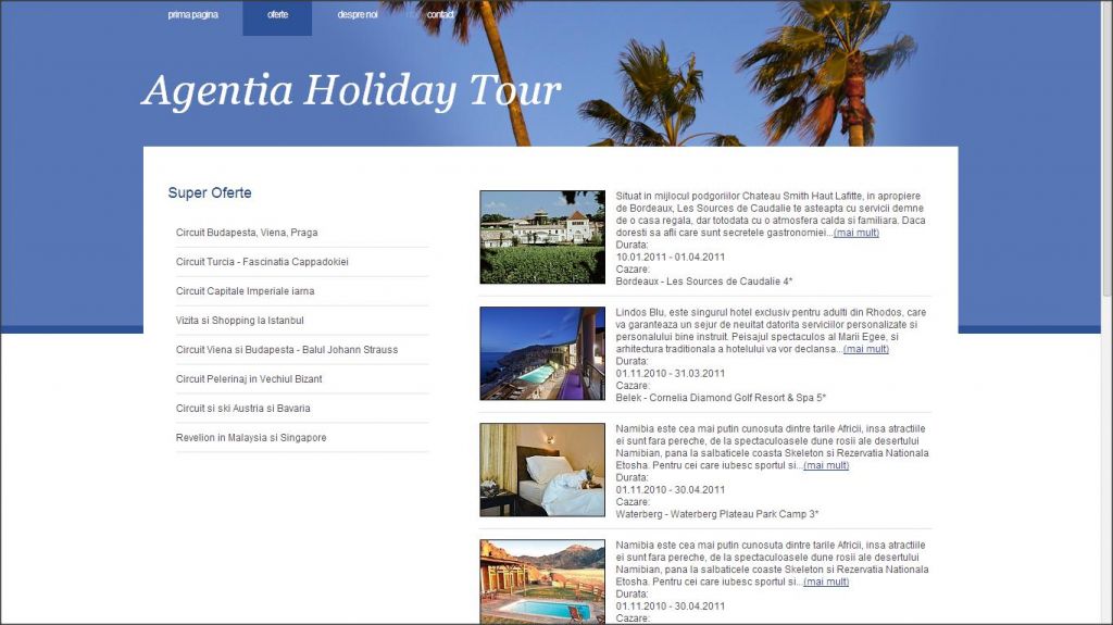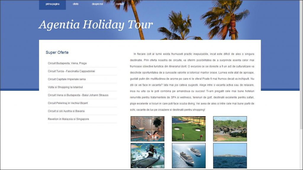 Acest atestat la informatica are tema Agentia de turism Holiday Tour. Proiectul este realizat in HTML si se prezinta sub forma site-ului unei agentii de turism. Aici poti gasi informatii despre diverse vacante, circuite turistice, oferte precum si detalii despre companie si date de contact. Proiectul are un design foarte placut fiind presarat cu imagini din cele mai exotice locuri sau cu cele mai atractive puncte turistice ale lumii.