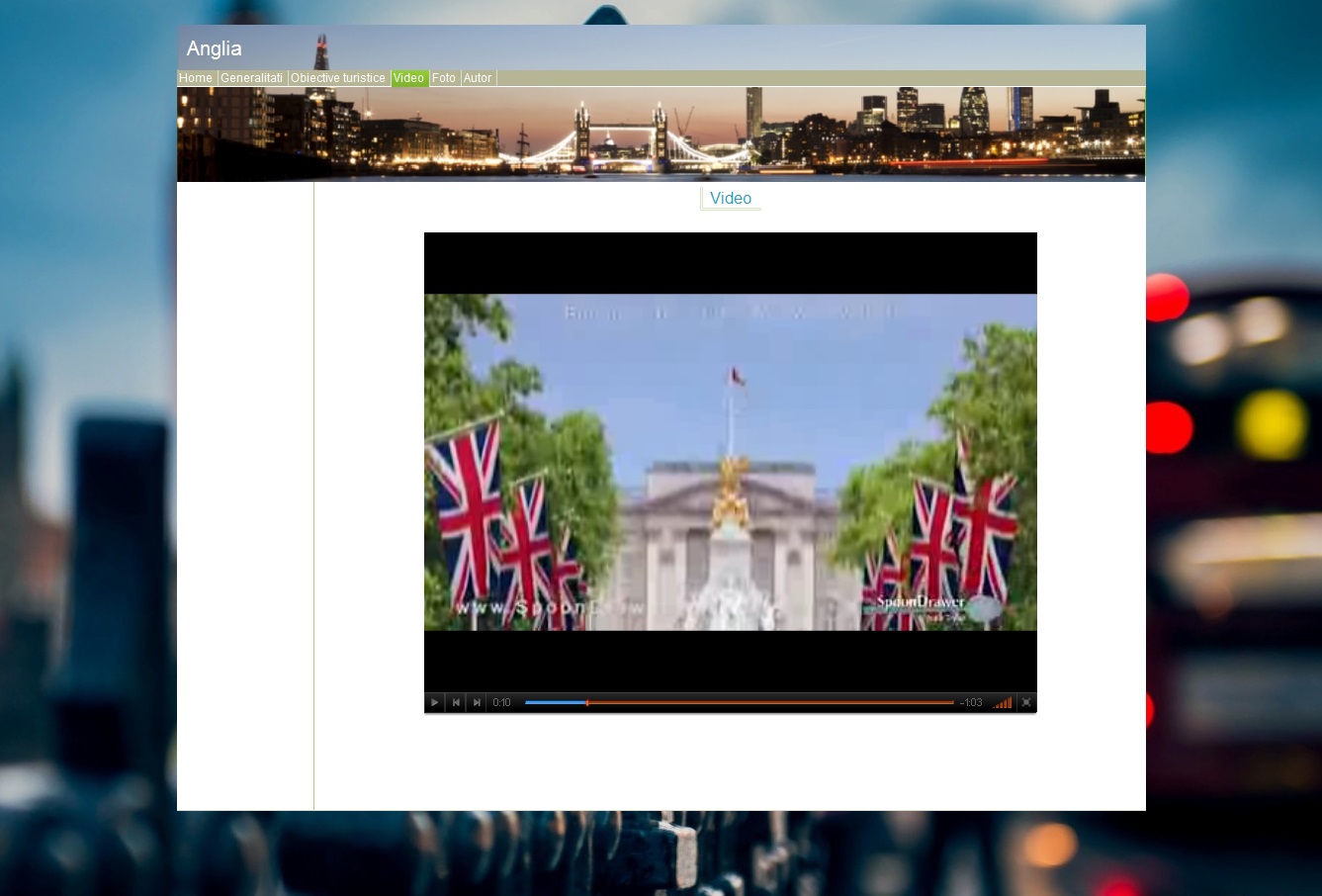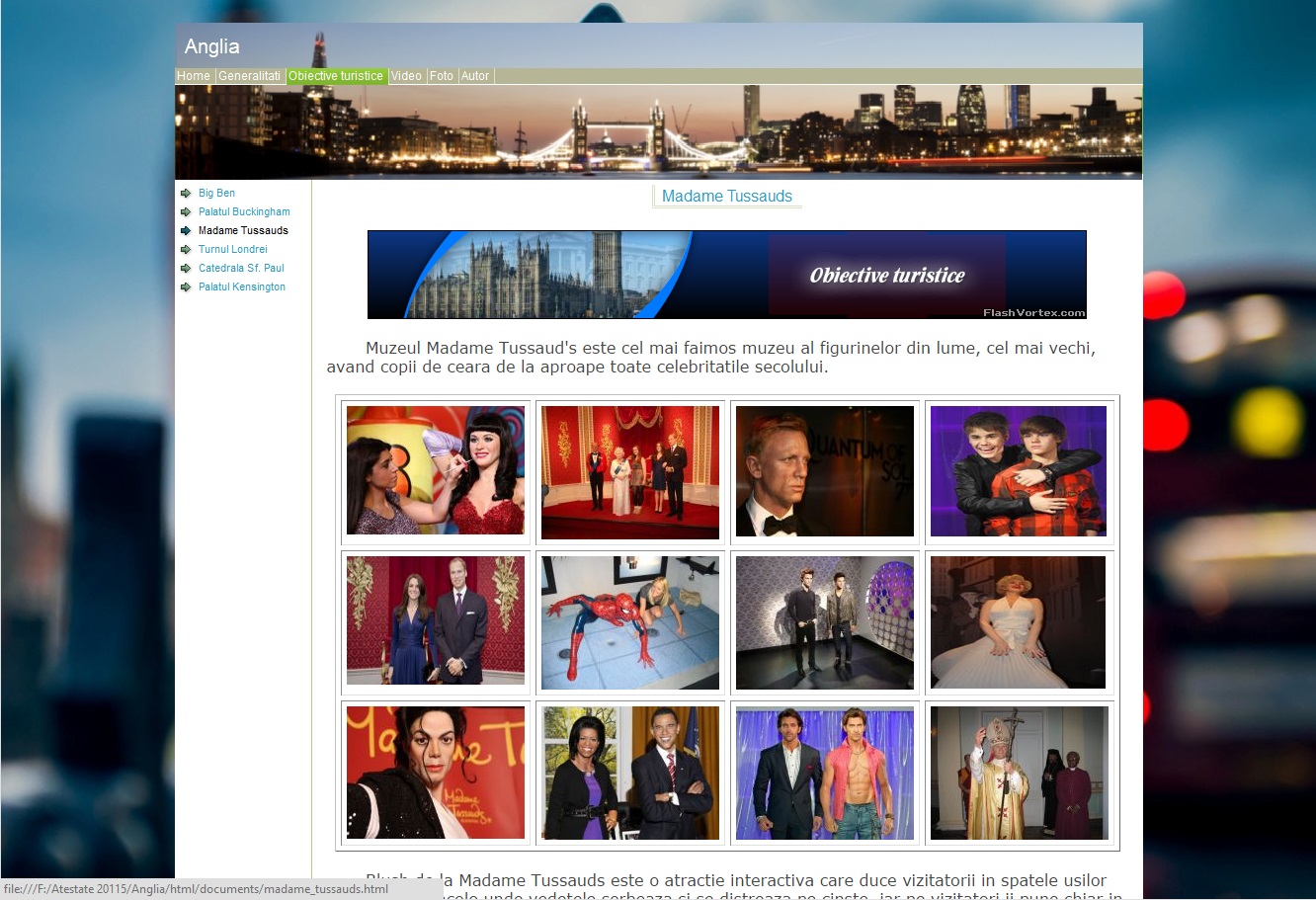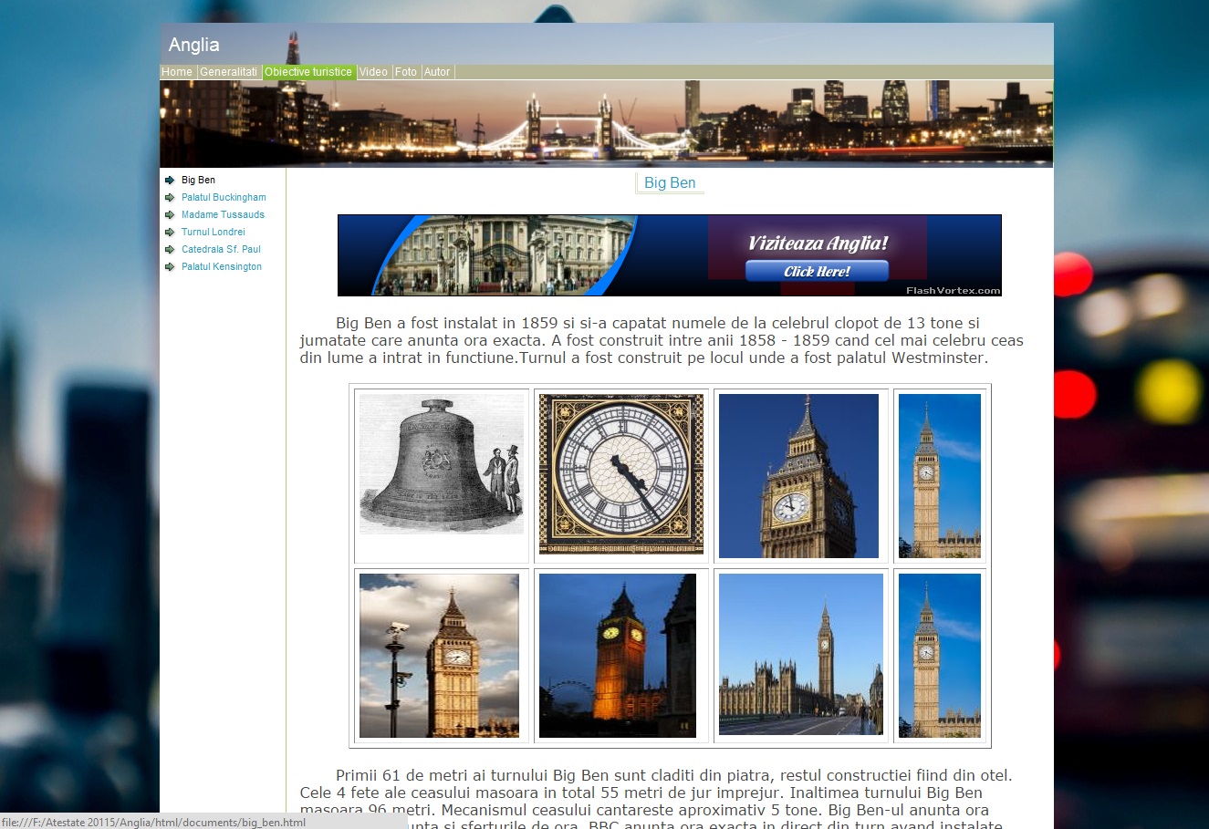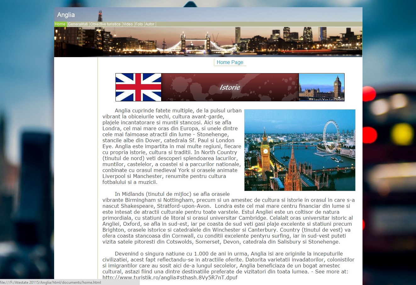 Atestatul cu tema Anglia este realizat in HTML si contine 2 tipuri de galerii foto (o galerie foto in HMTL plus JavaScript si o galerie foto in flash). Acest atestat la informatica contine 21 de pagini HTML si o documentatie in word de 31 de pagini.