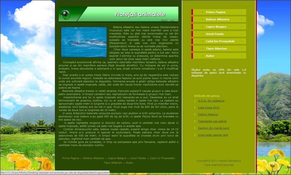 Proiectul este realizat in limbaj HTML si ofera informatii captivante despre animalele care sunt pe cale de disparitie atat de la noi din tara cat si din alte colturi ale lumii. Atestatul contine pagini HTML dedicate categoriilor de animale rare precum capra neagra, balena albastra, ursul panda,tigrul siberian, ursul polar, testoase, rechini,delfini si altele. Tot aici gasesti diverse articole despre animale pe cale de disparitie precum si imagini cu acestea.