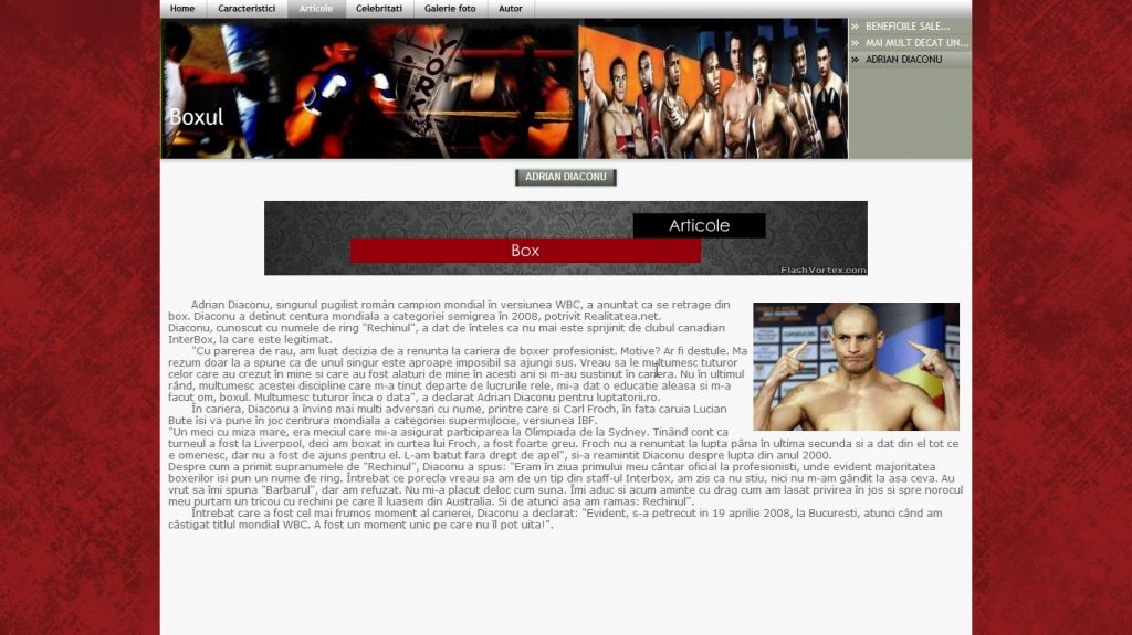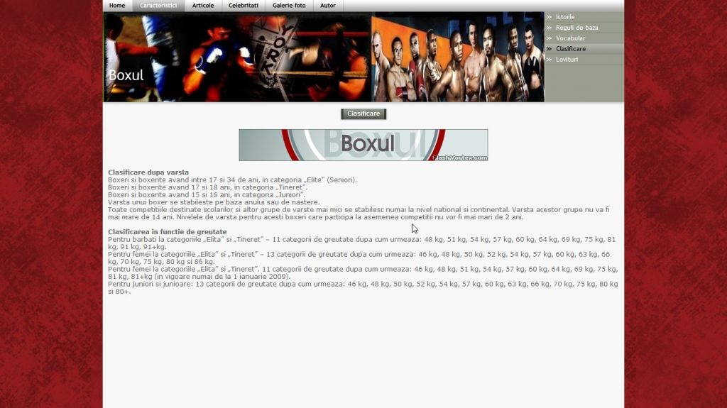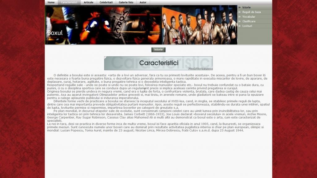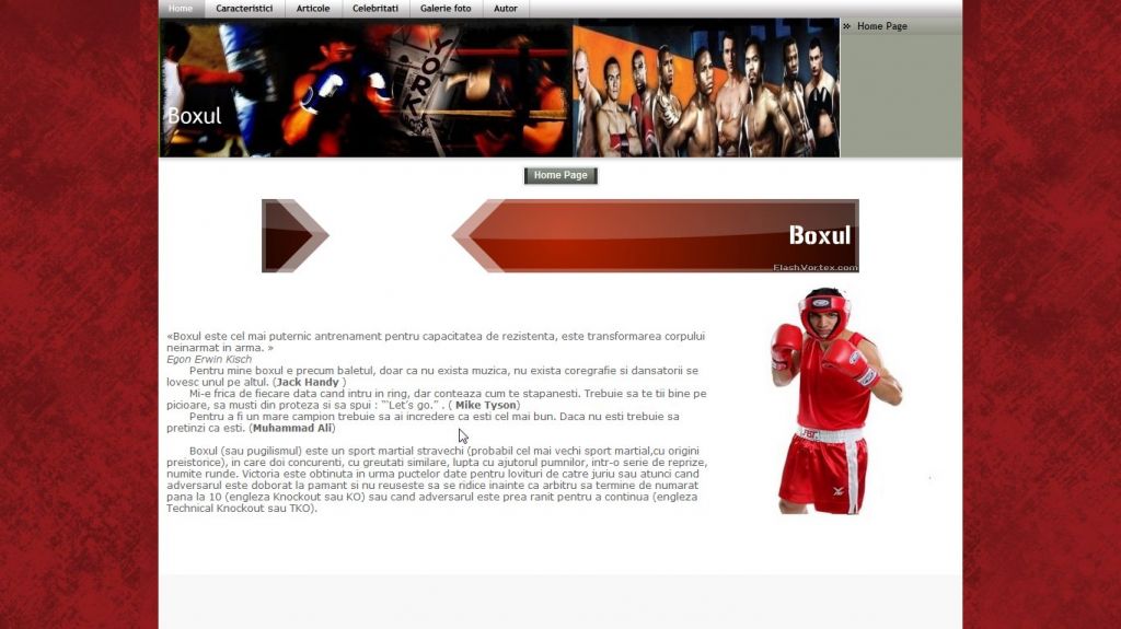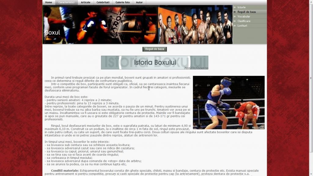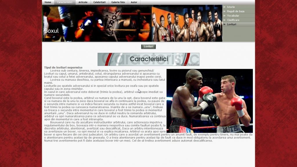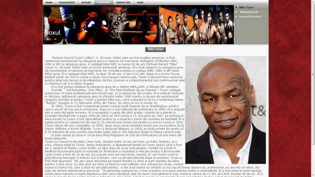 Un sport caracterizat de violenta, insensibilitate si putere, boxul este tema acestui atestat la informatica in HTML.Proiectul prezinta cateva generalitati despre acest sport, caracteristicile sale si celebritati precum Mike Tyson sau Leonard Doroftei. Fara indoiala galeria foto este prezenta si in acest proiect, dezvaluid momente si sportivi de seama ai sportului.