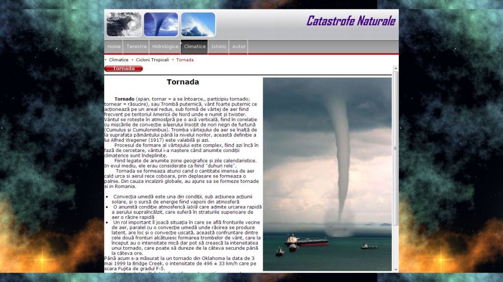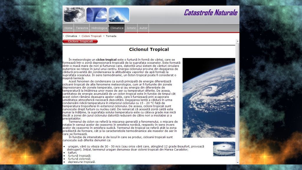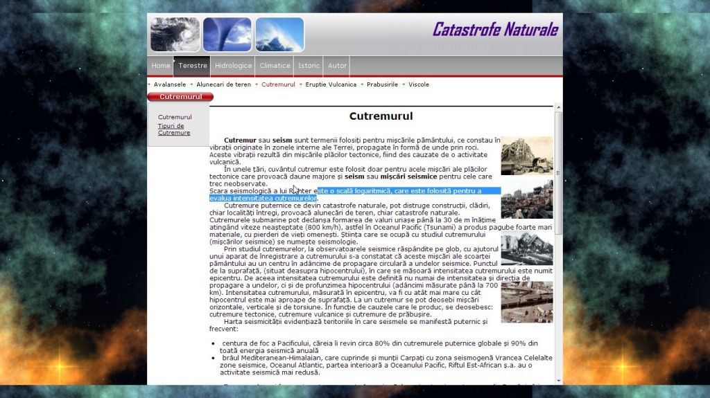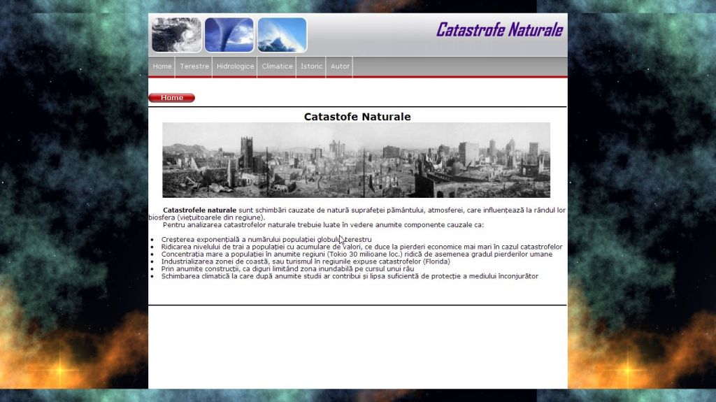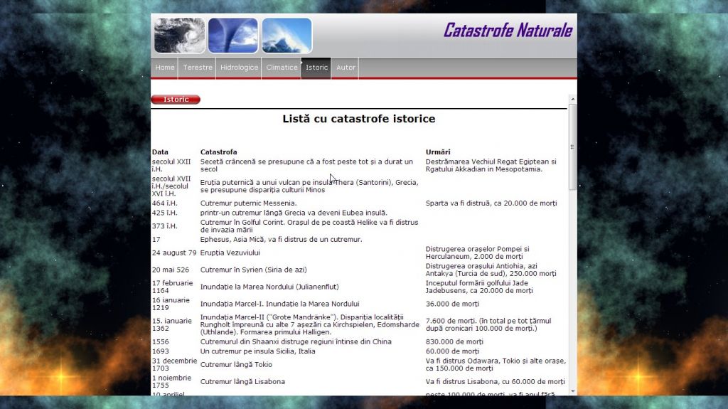 Din pacate in lumea intreaga au loc o multime de evenimente neplacute cunoscute sub numele de catastrofe naturale.Tema acestui atestat la informatica in HTML o constituie un subiect foarte des intalnit si in mass-media, care starneste interesul tuturor si anume catastrofe naturale.