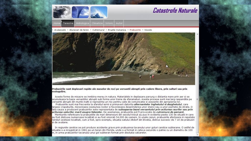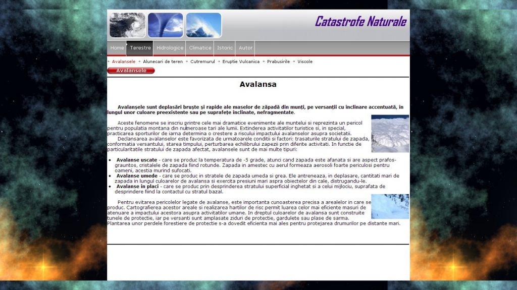 Proiectul prezinta catastrofele terestre (avalansa, alunecarea de teren, eruptia vulcanica etc.) si hazarde hidrografice si climatice. De asemenea contine si o lista cu catastrofe ce au marcat istoria omenirii pana in prezent.