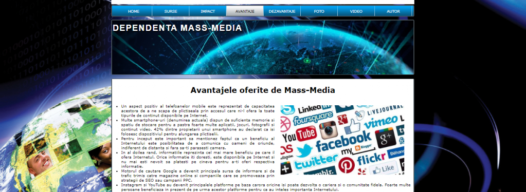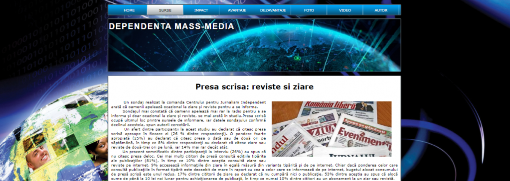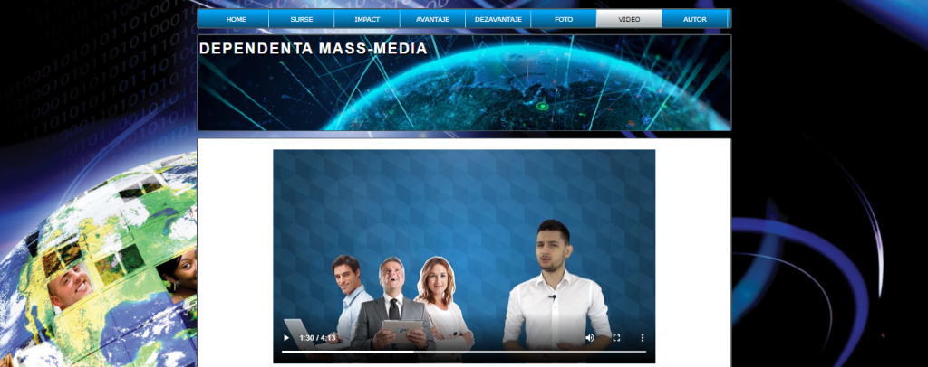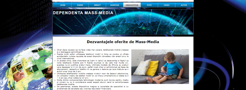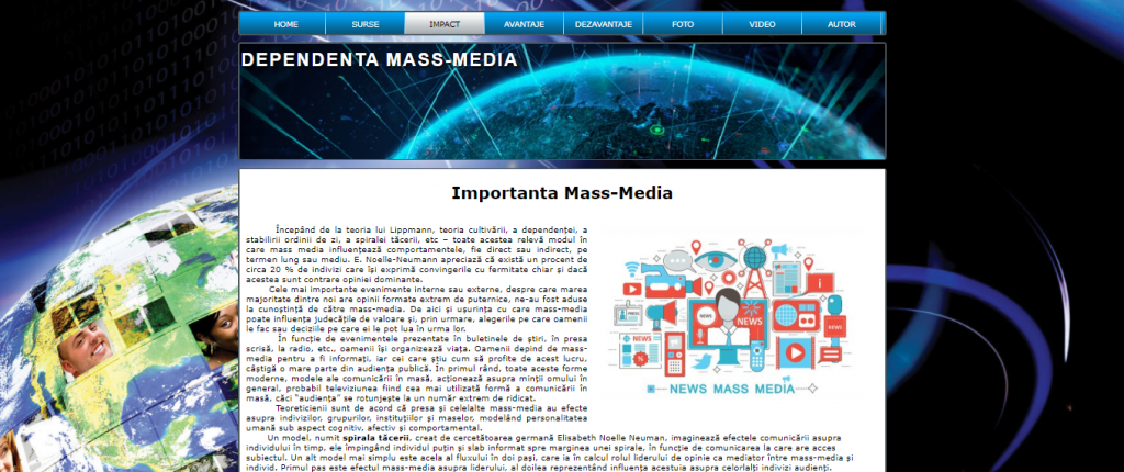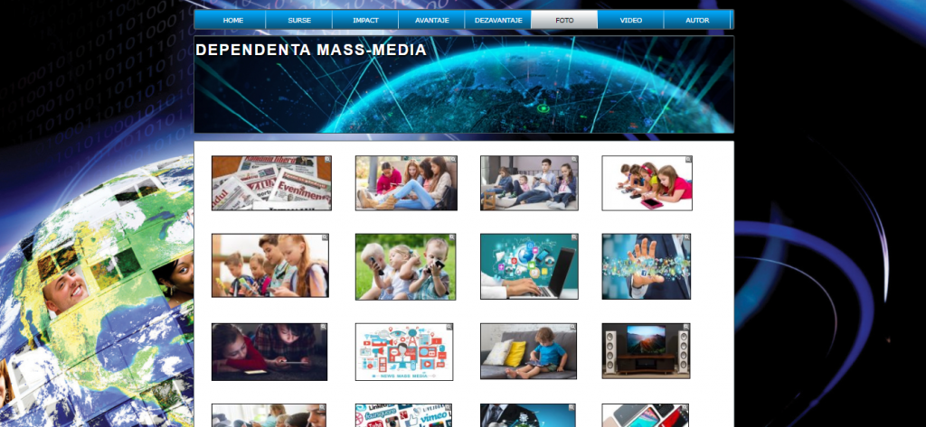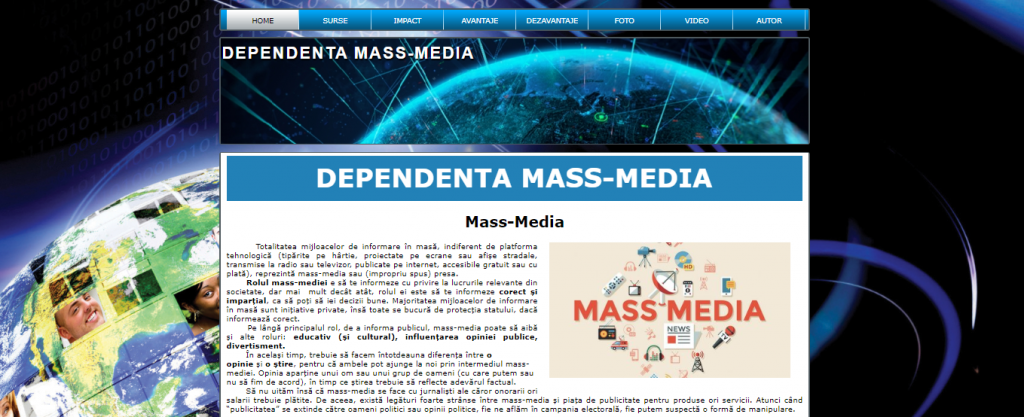 Proiectul nostru in html,numit Dependenta Mass-Media are in prim plan tot ceea ce reprezinta mass media,rolul acesteia,sursele de informare care sunt foarte numeroase,precum internetul,revistele sau telefoanele mobile.