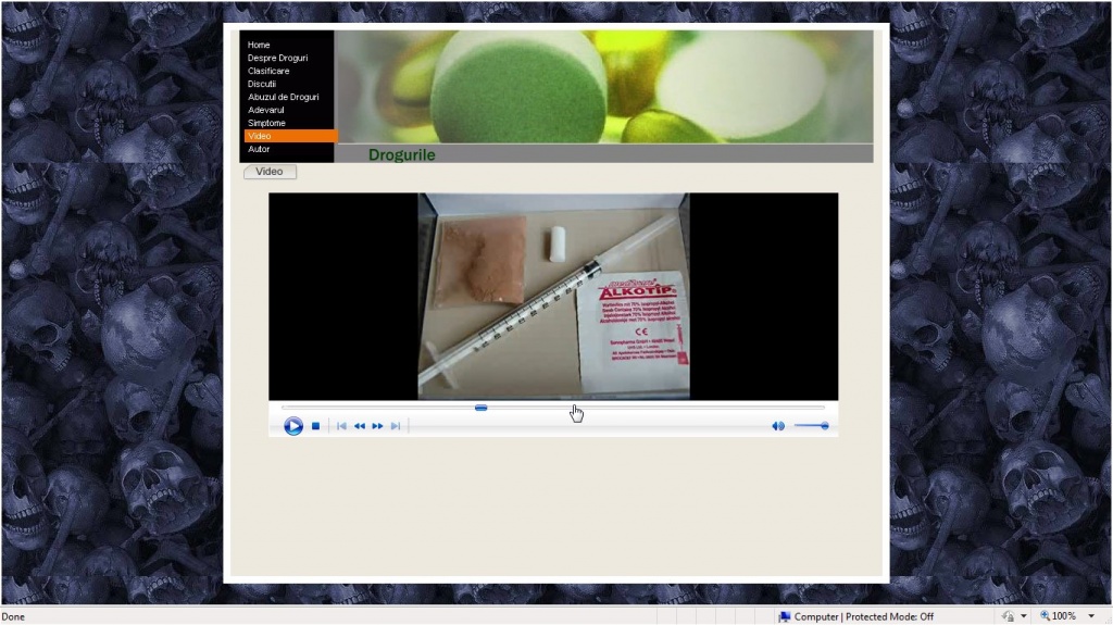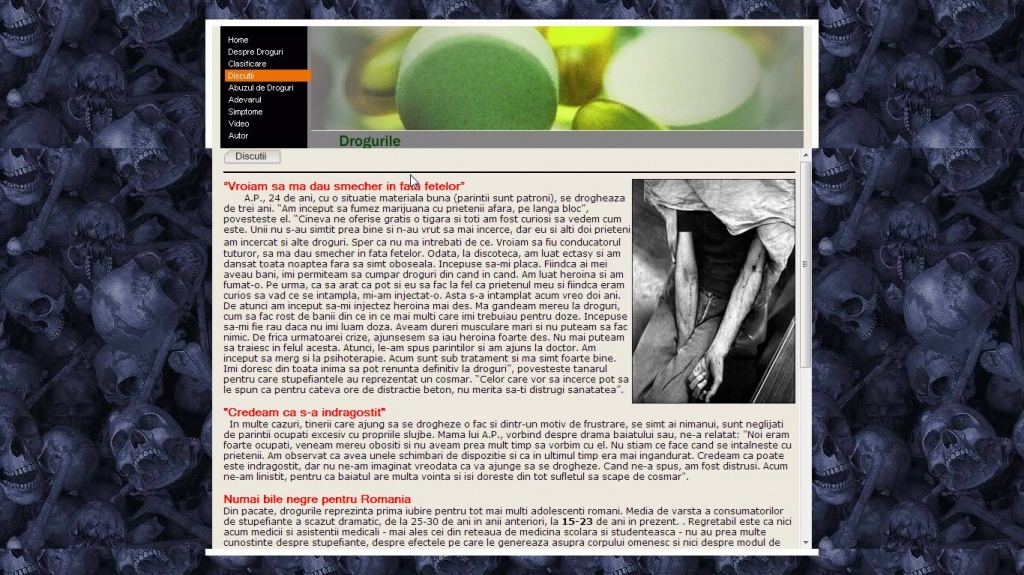 Atestatul incearca sa traga un semnal de alarma cu privire la consumul ridicat de droguri in randul tinerilor. Contine interviuri luate dependentilor de droguri si prezinta situatiile extreme prin care au trecut aceste persoane.Proiectul poate fi folosit pentru atestatul la informatica fiind realizat in html. Are 22 de pagini in html si o documentatie in word de 30 de pagini.