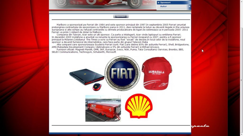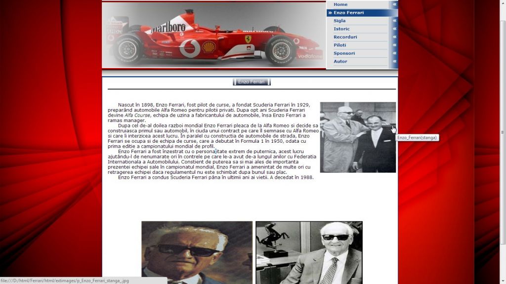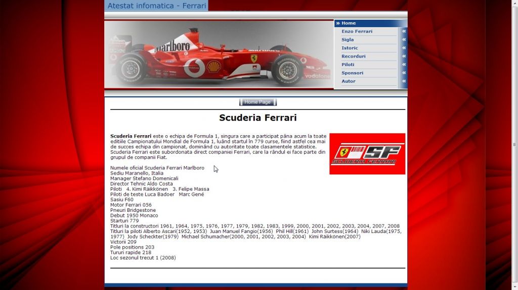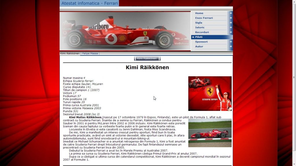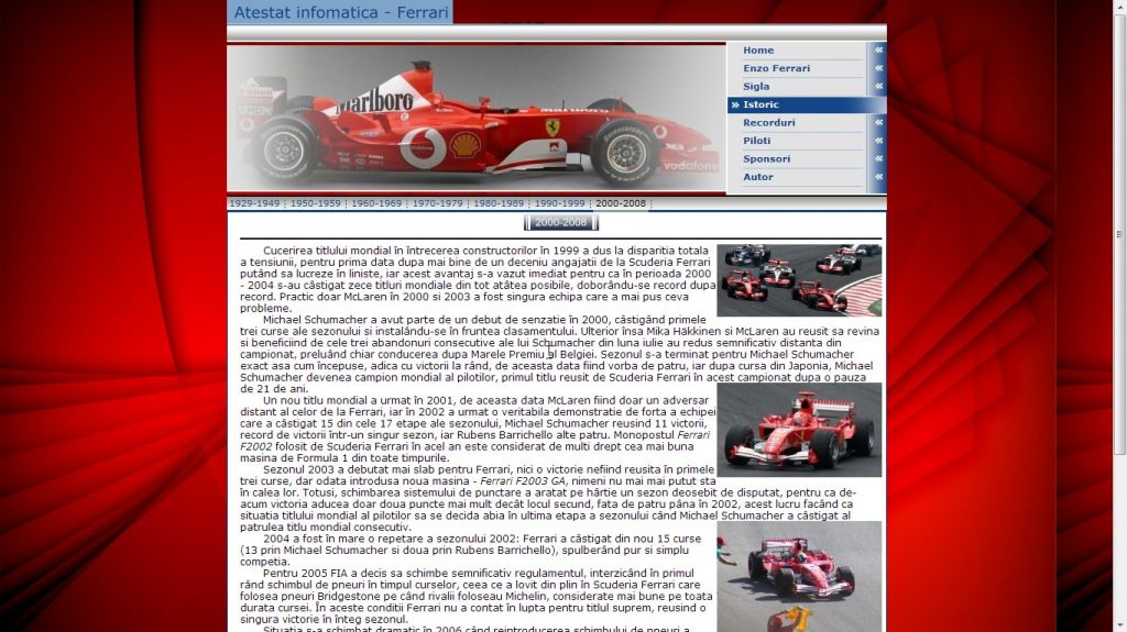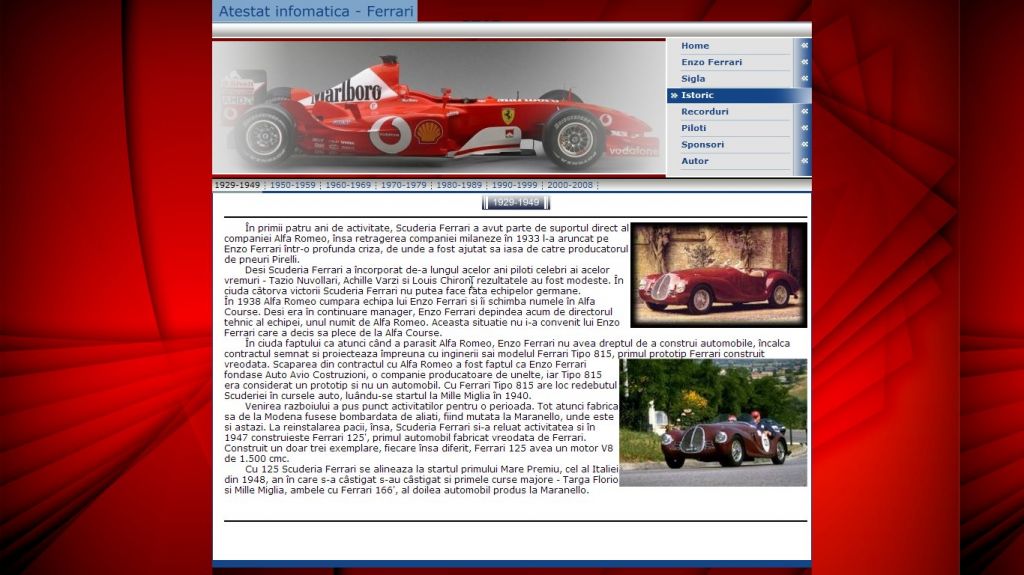 Echipele de Formula 1 Ferrari sunt cele care au luat recordurile la campionatele mondiale cu masini de mare viteza inca de la inceputuri si pana in prezent. Masinile Ferrari sunt subiectul dezvoltat de acest atestat la informatica in HTML.Proiectul ofera informatii bogate despre cum au luat nastere aceste supermasini, fondatorul acestora Enzo Ferrari, recordurile obtinute in cursele de raliu, piloti de Formula 1, sponsori si altele.