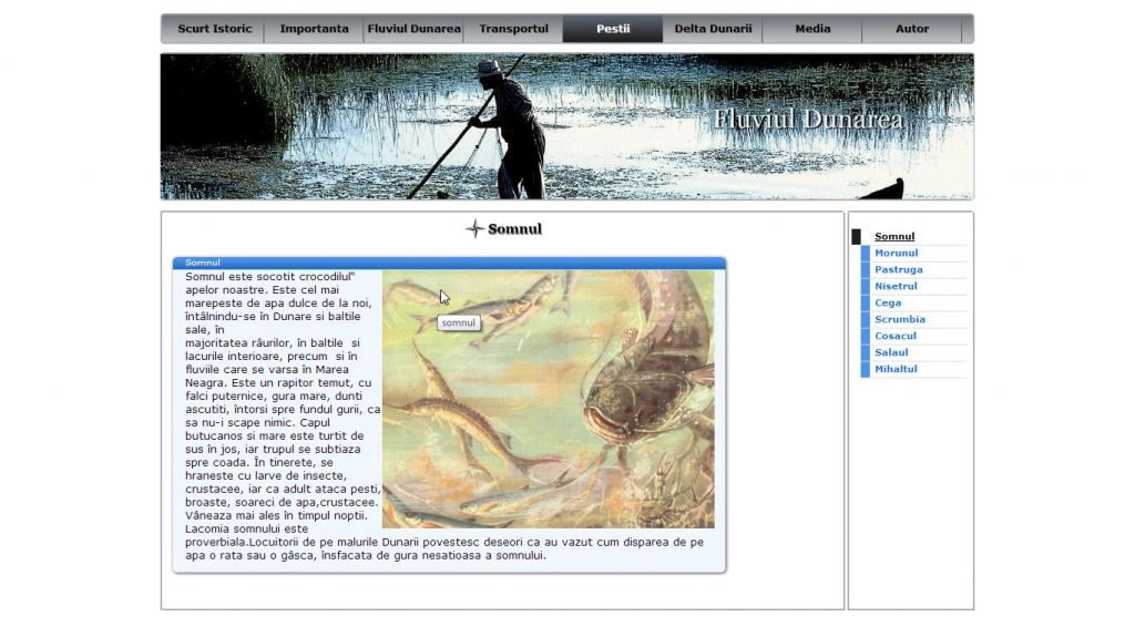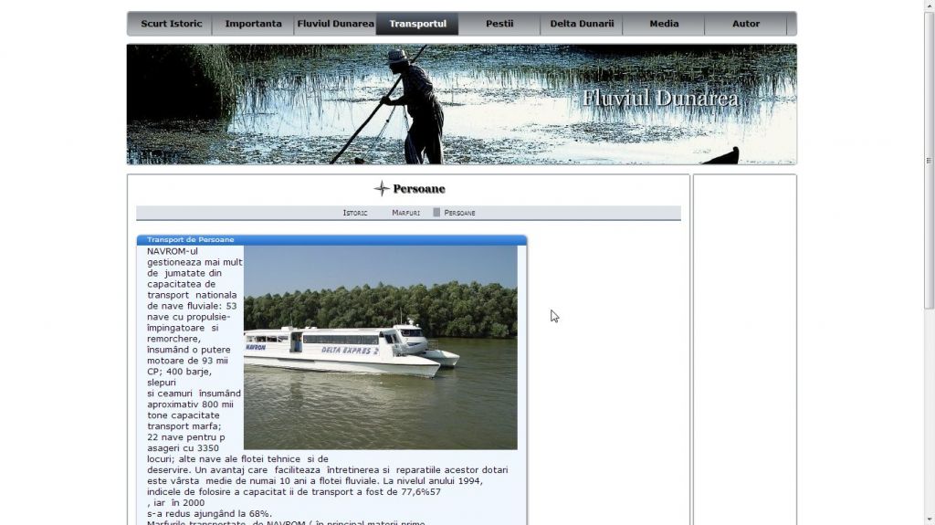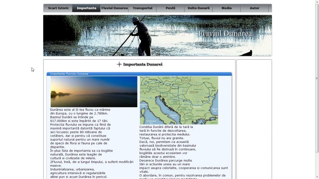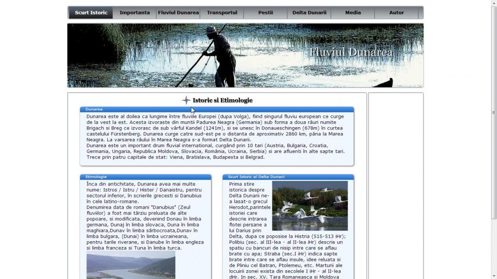 Nu numai deosebit de important pentru tara noastra din punct de vedere economic, fluviul Dunarea este un leagan de cultura si civilizatie de milenii si constituie tema acestui atestat la informatica in HTML.Acest atestat prezinta informatii despre fluviul Dunarea si Delta Dunarii: istoric, importanta, transport, fauna, flora etc. Pe langa imagini, proiectul contine si un video.
