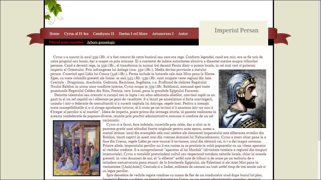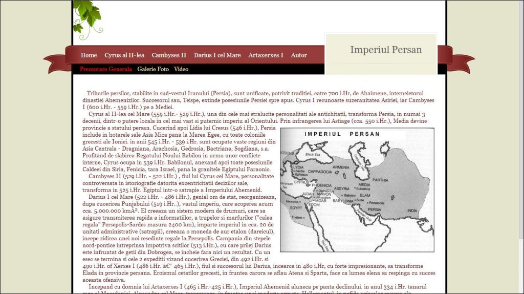 Tema acestui atestat la informatica este “Imperiul Persan”. Acest proiect este realizat in HTML si prezinta intr-o maniera exclusivista informatii din domeniul istoriei. Aici poti afla detalii despre domnia regilor persani si radacinile acestora, arborele genealogic a celor de vita nobila, precum si informatii despre expeditiile militare ale vremii. Atestatul contine si o galerie foto cu imagini sugestive pentru tema aleasa. Totodata acesta contine si o documentatie de 30 de pagini realizata in word.