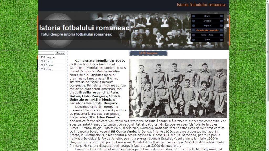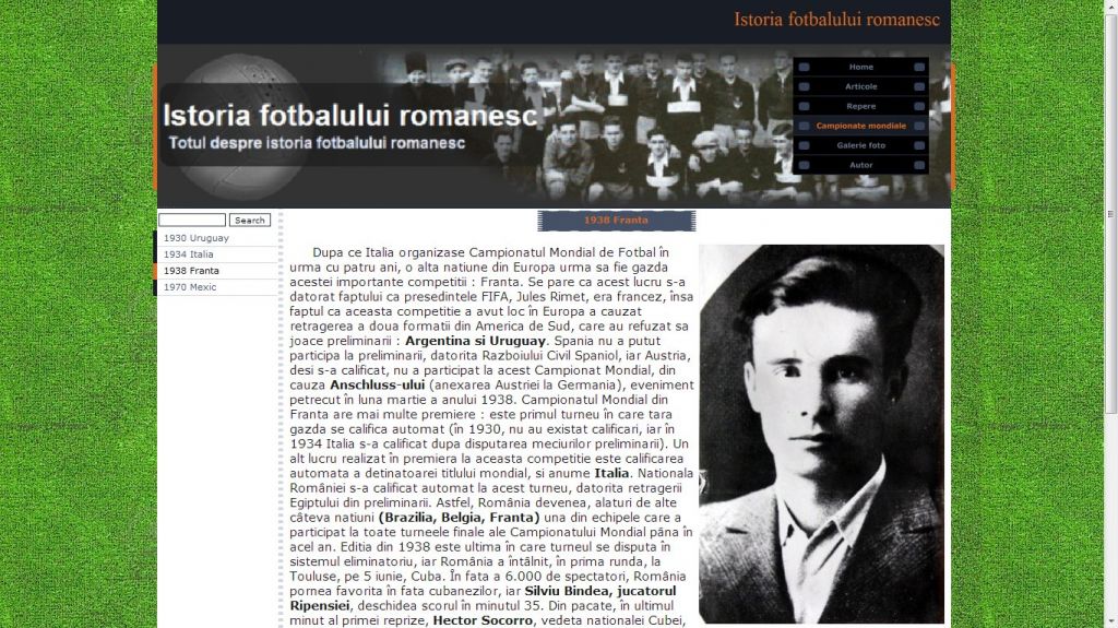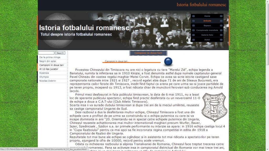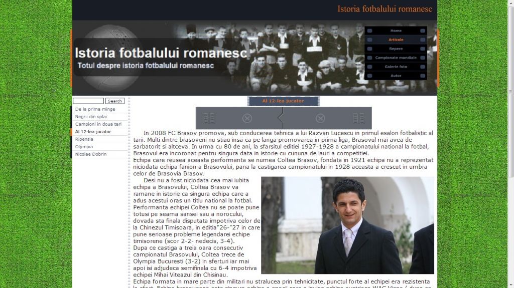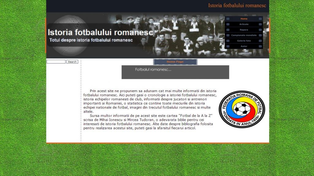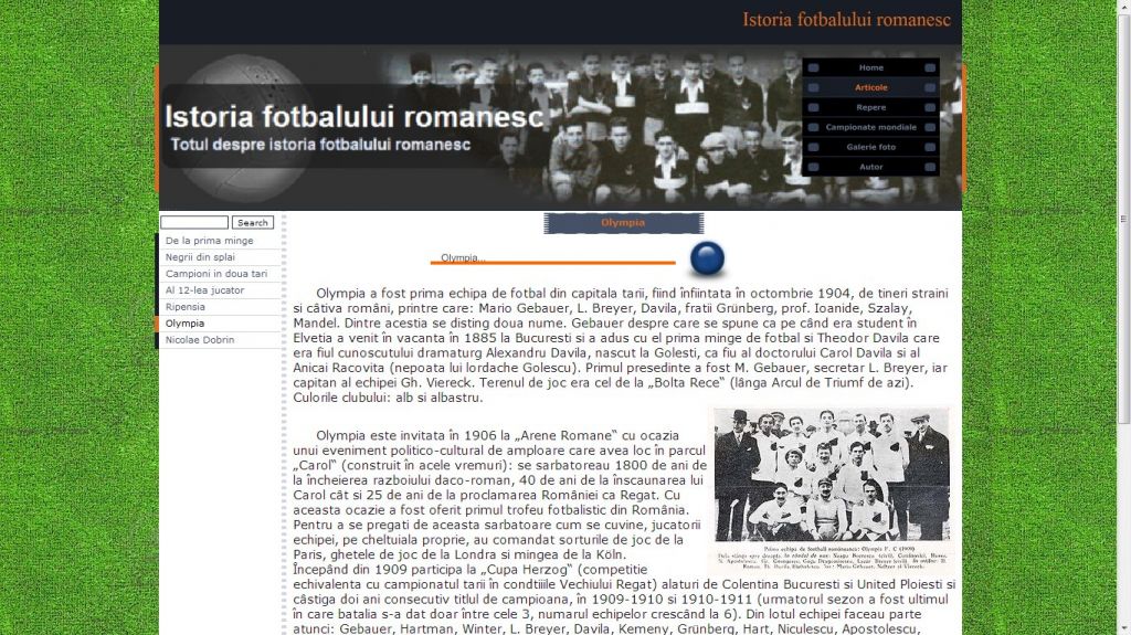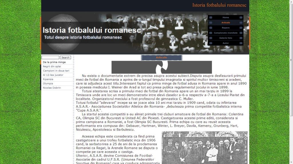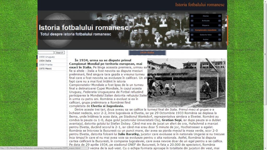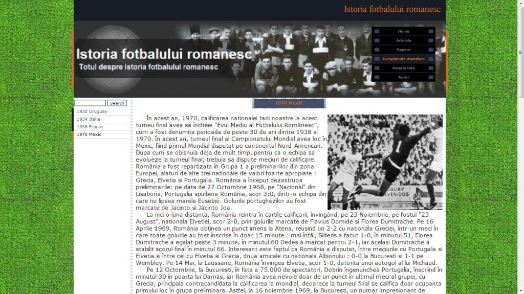 Cu un trecut memorabil, fotbalul se inscrie in categoria celor mai jucate jocuri de la noi. Acest atestat la informatica in HTML dezvolta tema istoria fotbalului romanesc.Atestatul prezinta informatii din domeniul fotbalului inca de la inceputurile sale in Romania: primul club, Ripensia, Prima Echipa, Olympia, sau unul dintre cei mai mari fotbalisti, Nicolae Dobrin. Proiectul contine si o galerie foto.