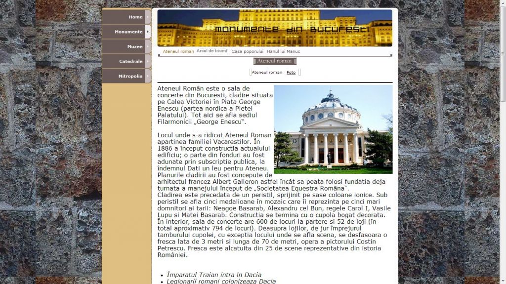 Capitala Romaniei, Bucurestiul contine o multime de atractii turistice in materie de muzee, cetati si alte monumente. Tema acestui atestat la informatica in HTML este intitulata monumente din Bucuresti.Proiectul HTML prezinta informatii despre principalele atractii din capitala, muzee, catedrale, monumente din Bucuresti precum Casa Poporului, Ateneul roman, Arcul de triumf, Hanul lui Manuc. Atestatul contine mai multe galerii foto referitoare la monumentele din Bucuresti ce merita vazute.
