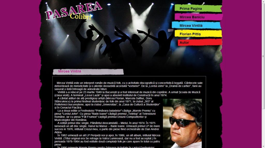 Pasarea Colibri este una din trupele folk romanesti care a ramas la sufletul multor romani prin hiturile ce le-au lansat inca din anul 1992. Tema acestui atestat la informatica in HTML o constituie trupa Pasarea Colibri.Proiectul HTML prezinta informatii despre Pasarea Colibri, membrii trupei, Mircea Vintila, Mircea Baniciu, Florian Pittis, discografie, piese si mai multe imagini ale artistilor.