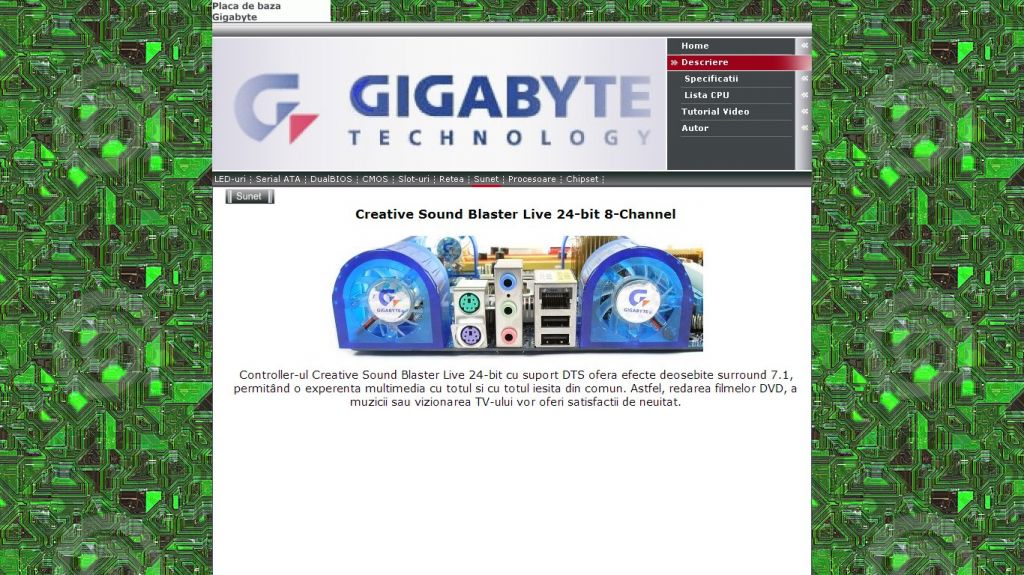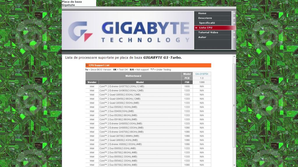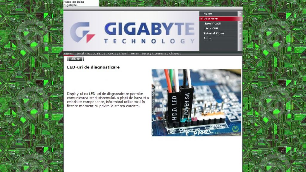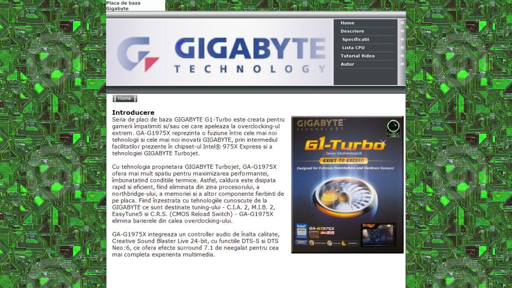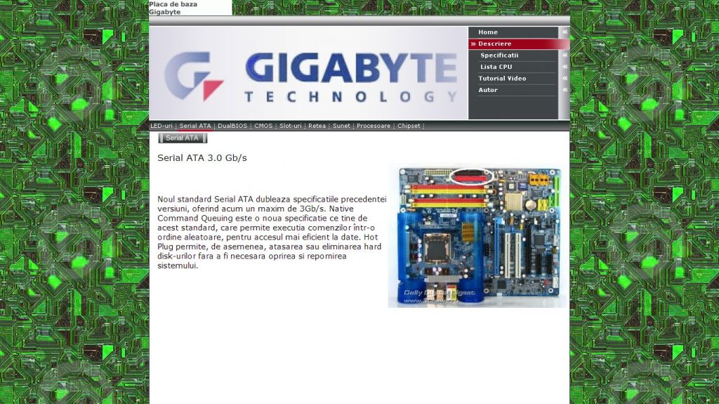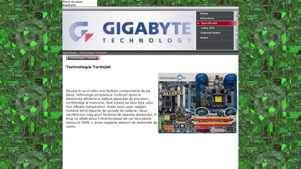 In secolul XXI, intr-o lume in care totul este in continua miscare, in care se tinde spre o automatizare tot mai extinsa, calculatorul este un “accesoriu” indispensabil.Acest atestat in HTML este despre calculator si anume despre placa de baza. Proiectul prezinta informatii despre descrierea acestor componete PC, specificatii etc. Pe langa acestea in acest atestat poti gasi o lista de procesoare suportate de placa de baza GIGABYTE G1-Turbo si un tutorial video.