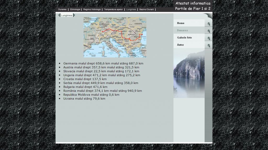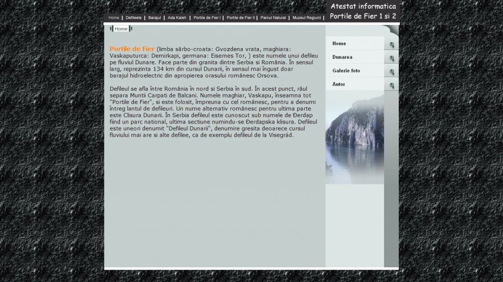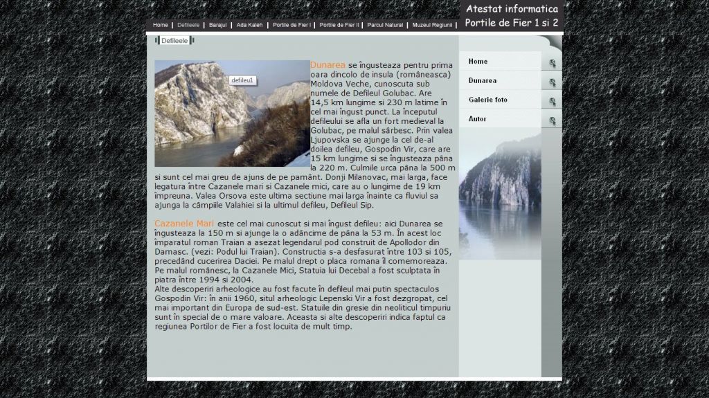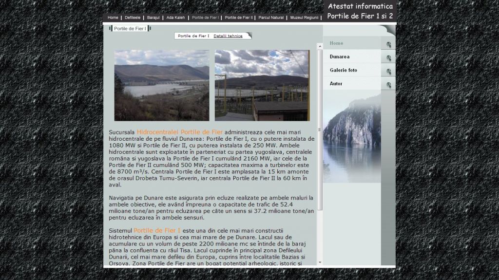 Obiective deosibit de importante pentru economia tarii, barajele de la Portile de Fier constituie tema acestui atestat la informatica in HTML.Acest atesat prezinta informatii despre defileele Portile de Fier I si II, baraje, Parcul natural, Muzeul Regiunii de la Drobeta Turnu Severin si alte informatii interesante cu privire la fluviul Dunarea si hidrocentralele de pe acest curs fluvial. Totodata, contine si o galerie foto foarte frumoasa.
