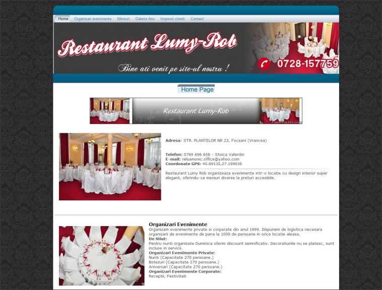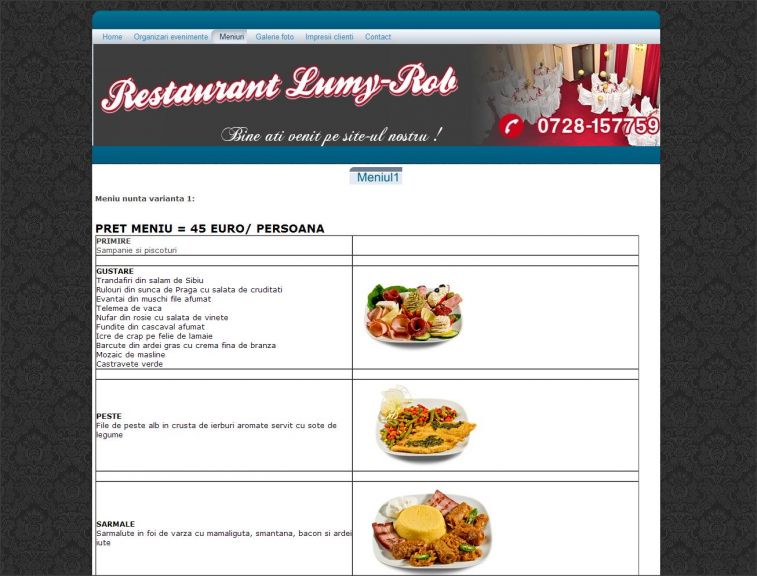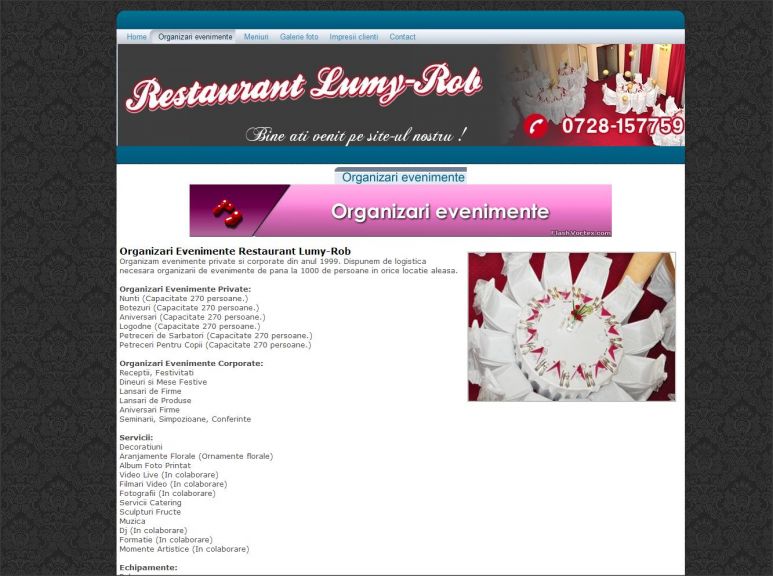 Site-ul de prezentare a Restaurantului Lumy-Rob constituie si tema acestui atestat la informatica realizat in HTML. Utilizatorii acestui site au posibilitatea de a afla detalii despre serviciile oferite clientilor de Restaurantul Lumy-Rob, organizari de nunti si evenimente, meniuri special create. Aici gasesti informatii de contact, galerii foto si video-uri. Designul acestui proiect este unul foarte atractiv, fiind presarat de multe imagini. Animatiile in flash dau un plus de culoare paginilor. Totodata acesta contine si o documentatie de 30 de pagini realizata in word.