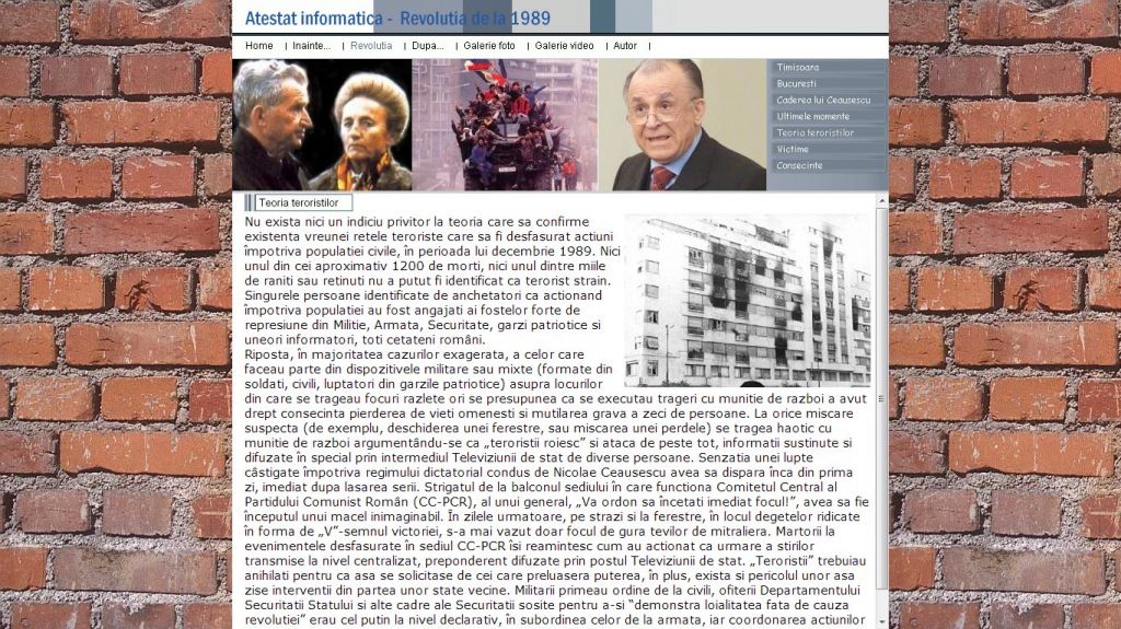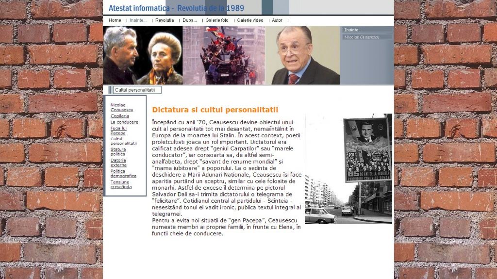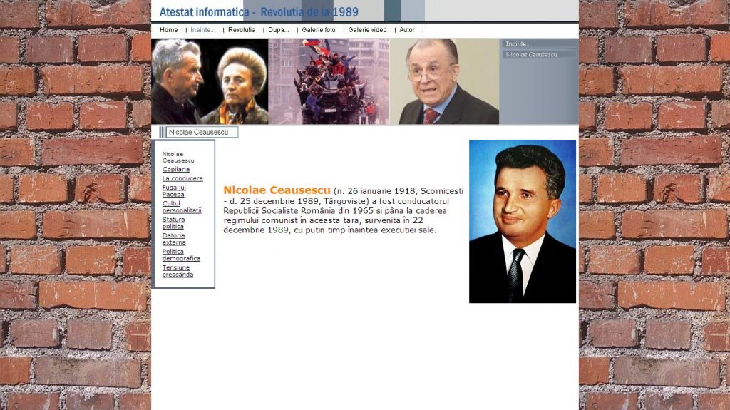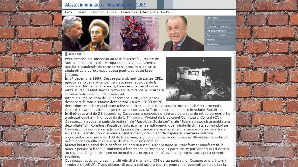 Revoluatia de la 1989 a reprezentat un moment de rascruce in istoria poporului roman, un moment in care s-a incheiat o etapa, in care s-a nascut un nou destin pentru romani.Acest atestat la informatica realizat in HTML iti ofera o istorie sincera a perioadei dinainte si de dupa revolutia de la 1989, momentul in sine, caderea regimului comunist precum si informatii despre controversatul cuplu al vremii, Nicolae si Elena Ceausescu. Aici gasesti si alte date interesante despre trecerea de la un regim la altul, victimele si consecintele acestei revolutii. Proiectul este insotit de o galerie foto precum si de una video.