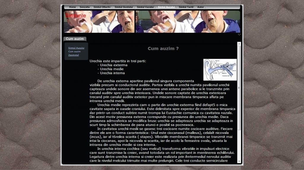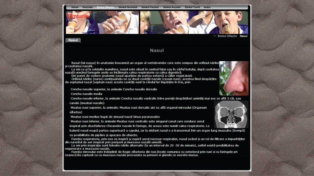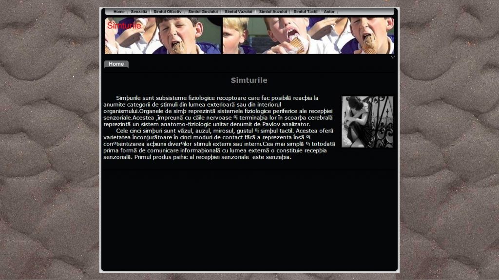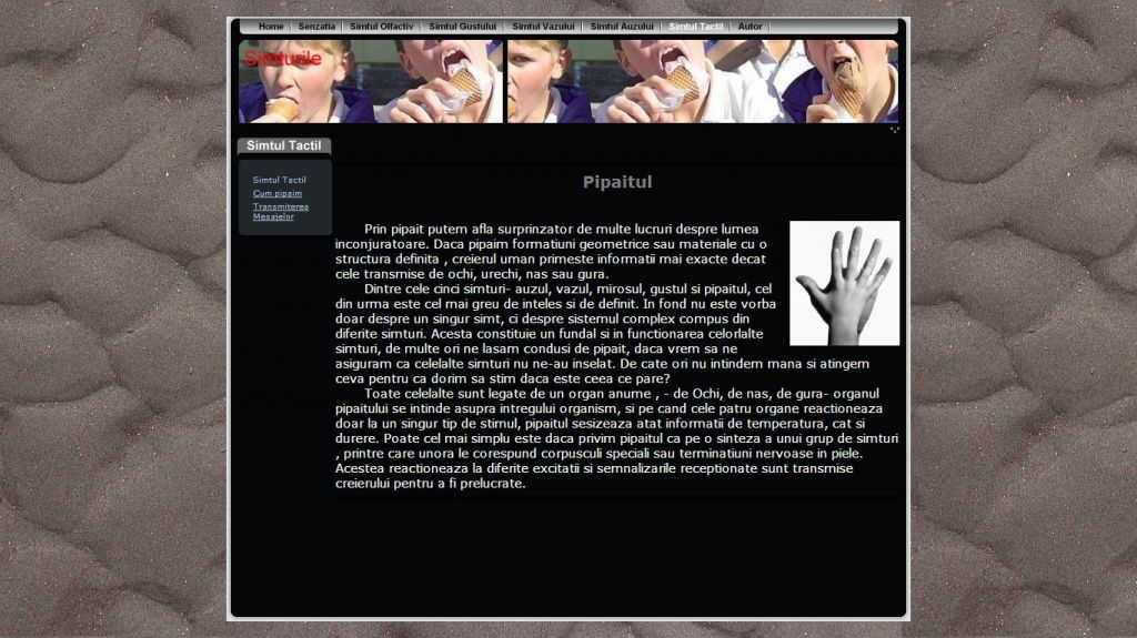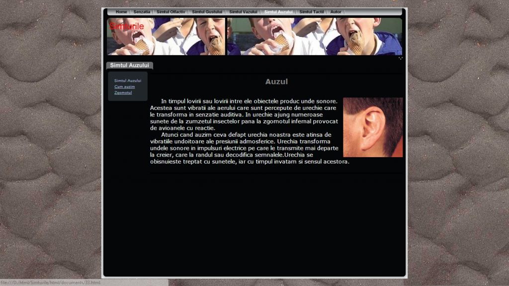 Ati incercat vreodata sa va imaginati cum ar fi viata fara sa vezi, sa auzi, sa mirosi, sa pipai, sa simti gustul? Pentru toate acestea exista senzatiile. Acestea sunt o reflectare a unor insusiri izolate ale obiectelor din realitate care actioneaza nemijlocit asupra organelor de simt. Acest atestat la informatica in HTML dezvolta acest subiect abordand teme atat din domeniul biologiei cat si al psihologiei.Proiectul prezinta informatii despre senzatii si cele cinci simturi: simtul olfactiv, simtul gustului, vazului, auzului si cel tactil. Alte subiecte interesante ce le poti gasi in acest atestat sunt referitoare la cum auzim, zgomotul, cum pipaim, transmiterea de mesaje si altele.