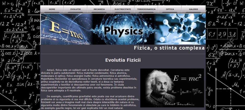 Aceasta materie este formata din mai multe ramuri: fizica atomica, fizica teoretica, fizica nucleara si fizica cuantica. In acest atestat html veti gasi atat informatii despre ramurile sale, cat si explicatii clare si imagini reprezentative pentru acumularea cu usurinta si logica a cunostintelor.