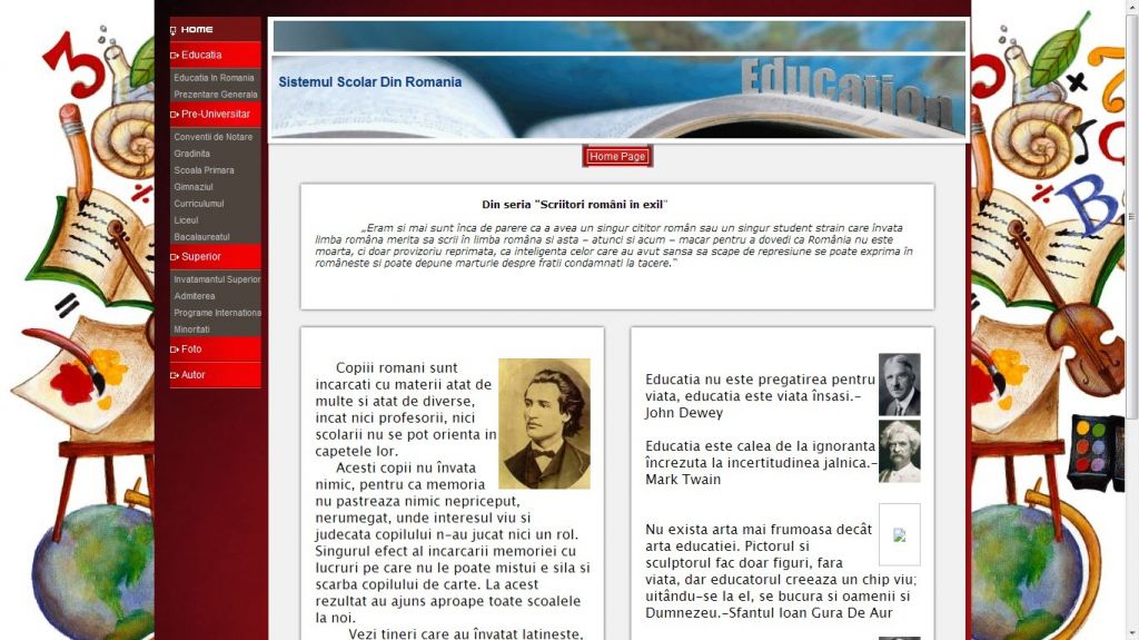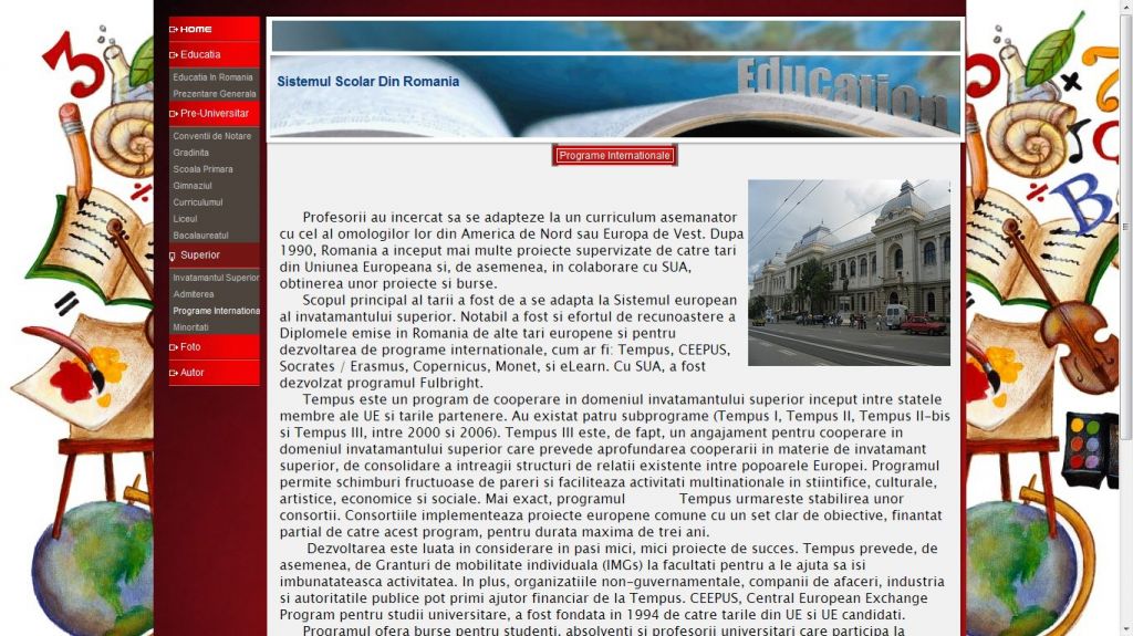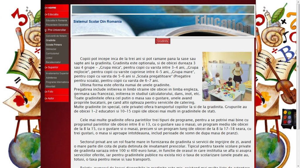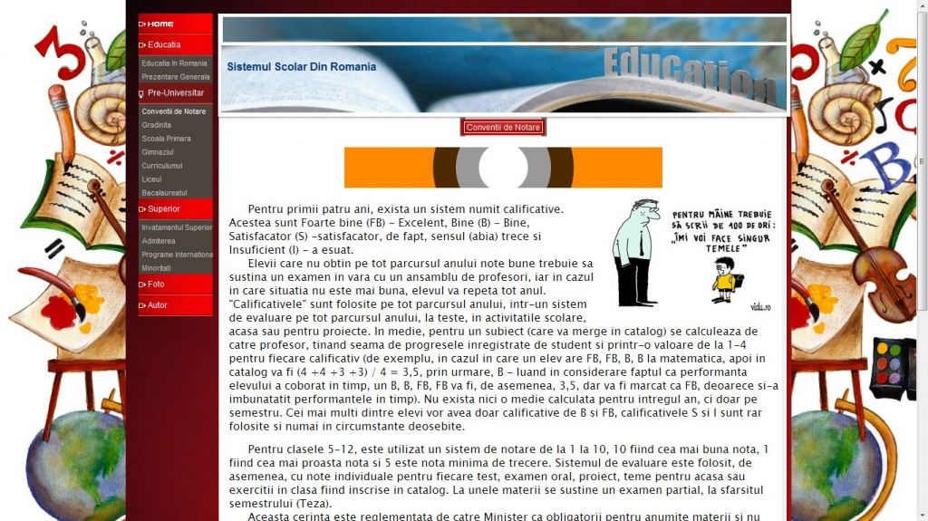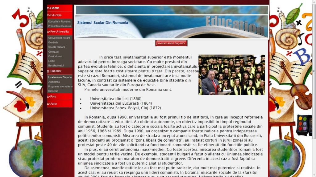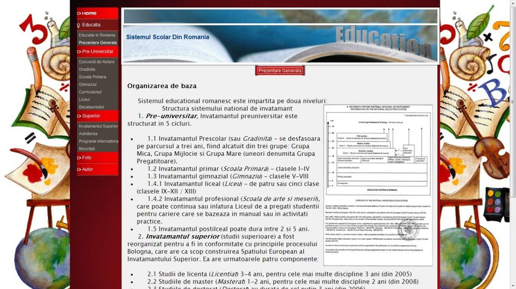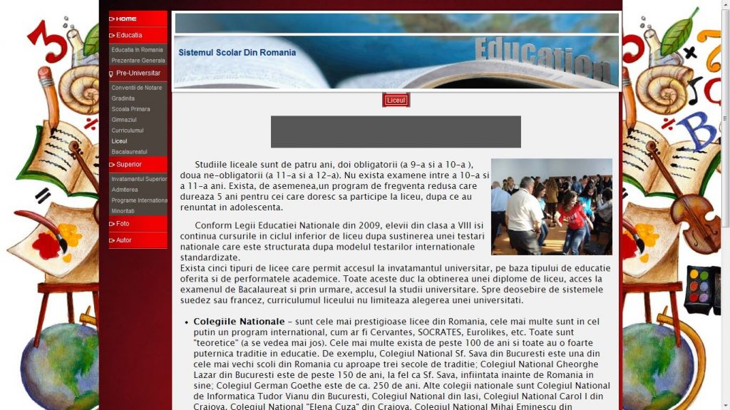 Sistemul scolar din Romania reprezinta tema acestui atestat la informatica in HTML fiind un subiect de actualitate si care ar trebui sa constituie macar un minim de interes pentru fiecare dintre noi.Proiectul prezinta informatii despre organizarea sistemului scolar de la noi din tara pe cicluri pre-universitare, invatamant superior, informatii despre educatie, sistem de notare, bacalaureat, admitere, alte detalii precum cele referitoare la minoritati, programe internationale si altele. Atestatul contine si o galerie foto.