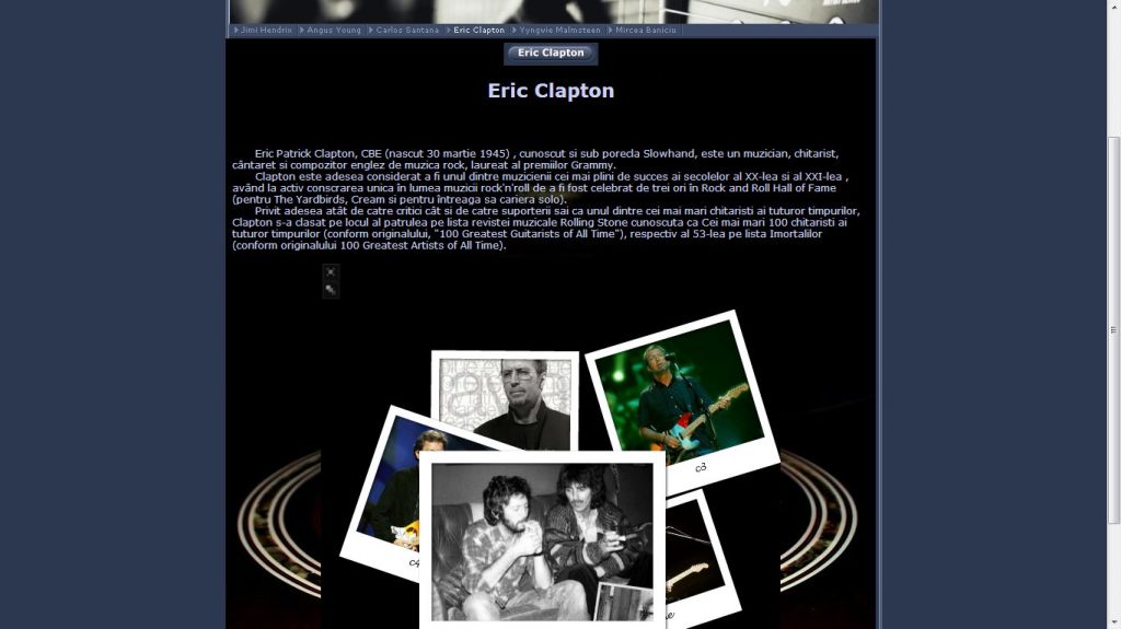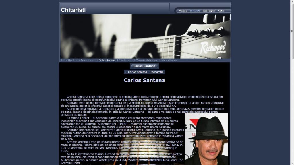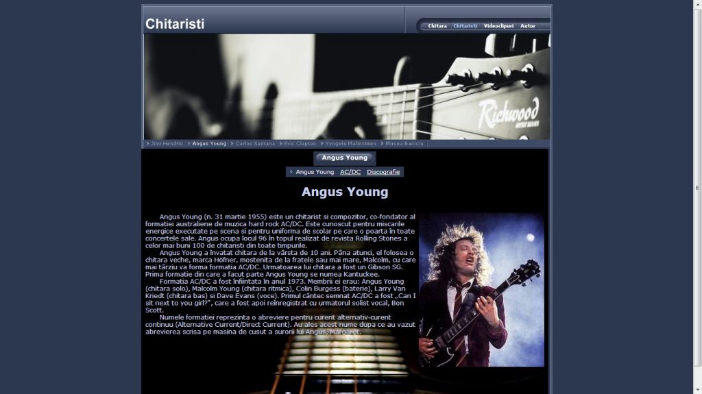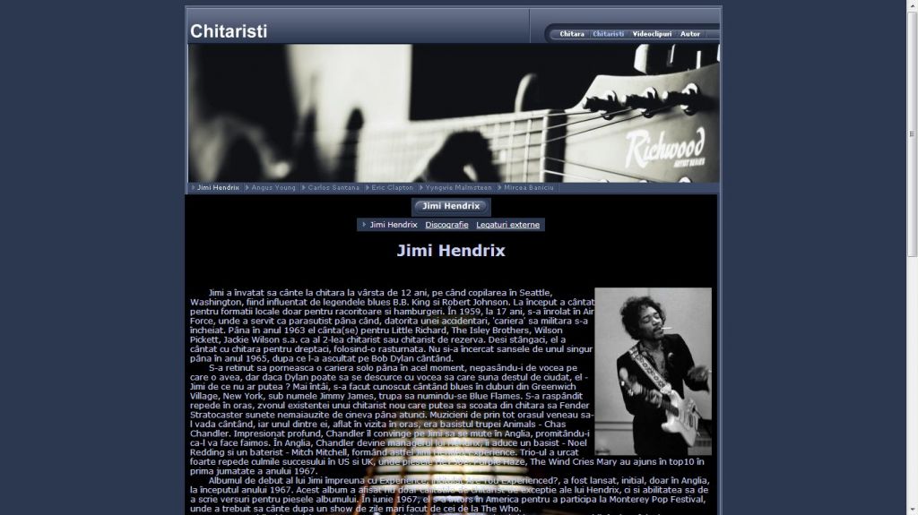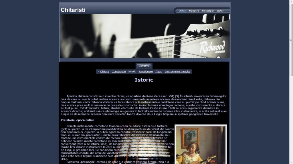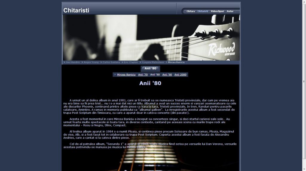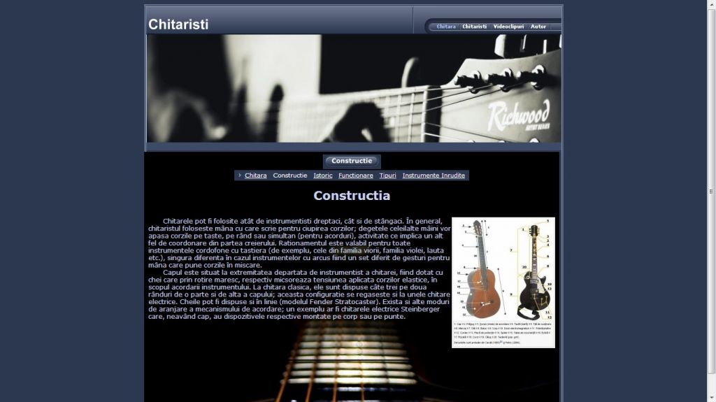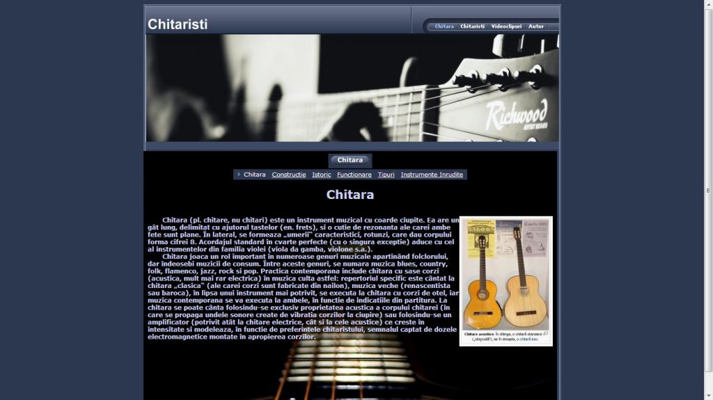 Acest atestat la informatic in HTML dezvolta o tema din domeniul muzicii si prezinta informatii despre instrumentul cu coarde ciupite, chitara, si chitaristi atat de la noi cat si din strainatate.Proiectul prezinta informatii despre aparitia instrumentului muzical cu coarde, chitara si modele de chitari, muzica anilor ’70, ’80, ’90 si 2000, chitaristi, discografie. Pe langa fotografii proiectul contine si un video referitor la tema acestui atestat.