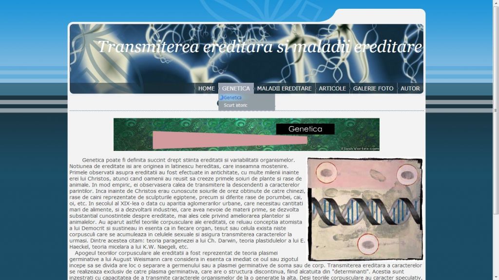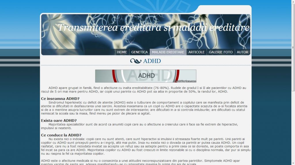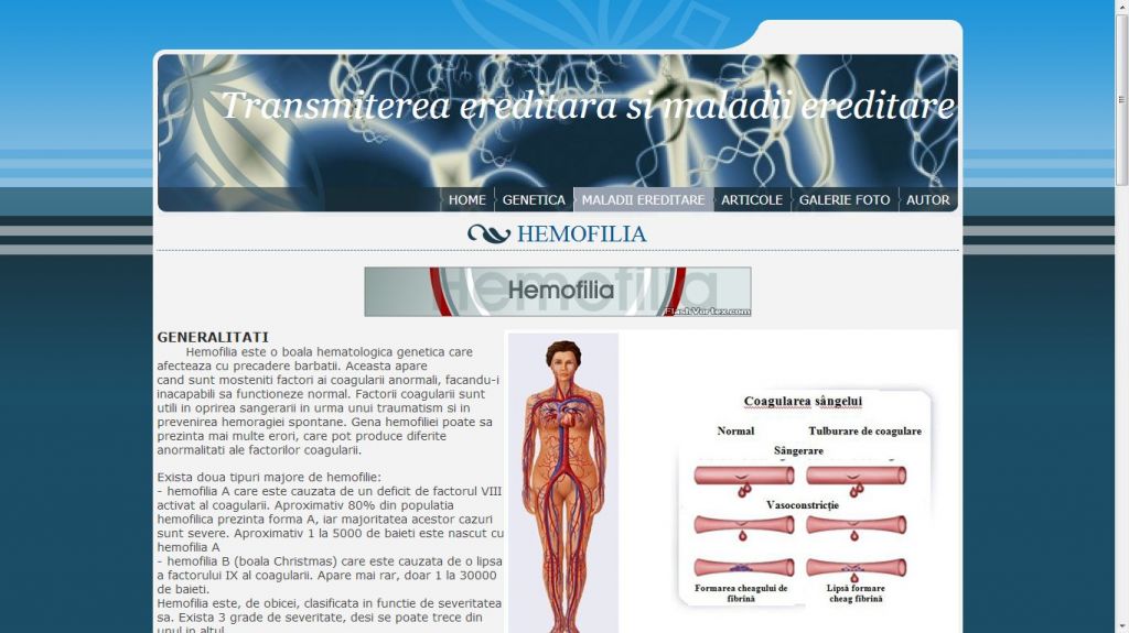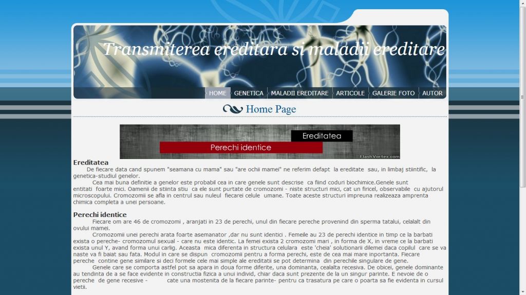 Fiecare dintre noi am mostenit de la parinti anumite gene. Din pacate exista persoane care mostenesc si unele afectiuni ale persoanelor ce le-au dat nastere si nu numai. Despre transmiterea ereditara si maladiile ereditare va prezentam si in acest atestat la informatica in HTML.Proiectul HTML prezinta informatii despre genetica, scurt istoric, boli ereditare precum hemofilia, sindromul down, sex-linkate si alte maladii. Aici poti gasi si alte articole despre boli si transmiterea ereditara a acestora, ca de exemplu primul virus care se transmite ereditar, bolile psihice s.a. Atestatul contine si o galerie foto.