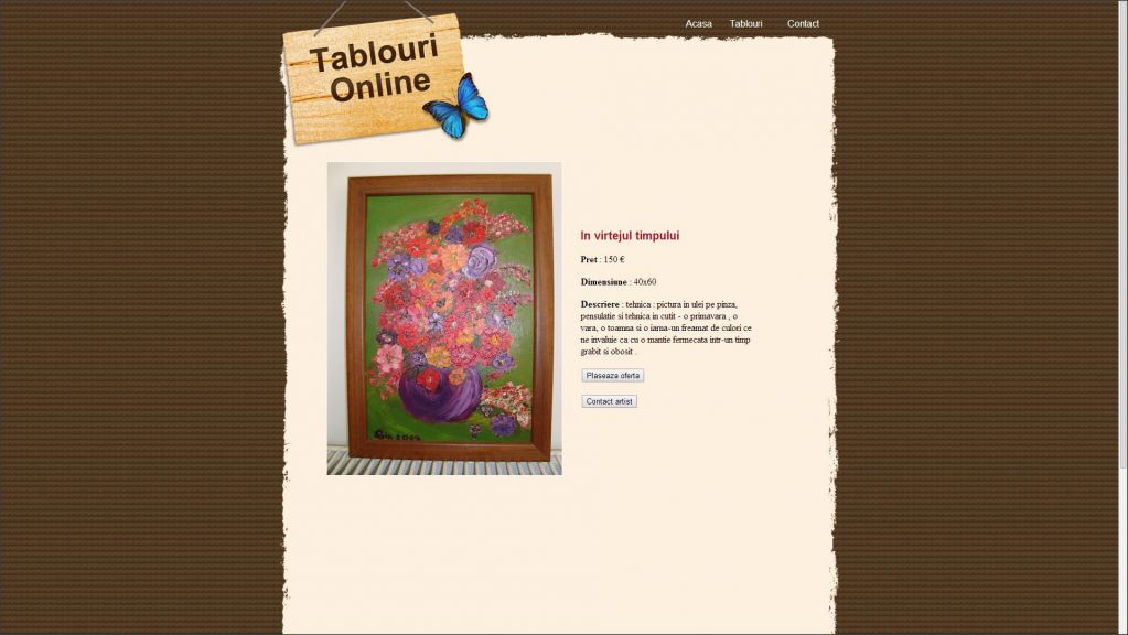 Proiectul contine o galerie de tablouri ce sunt scoase la vanzare. Clientii pot face oferte pentru fiecare tablou din proiect. In plus siteul contine un panou de administrare in care se pot efectua operatii de adaugare a unui nou tablou, modificarea datelor unui tablou din baza de date precum si stergerea unui tablou.