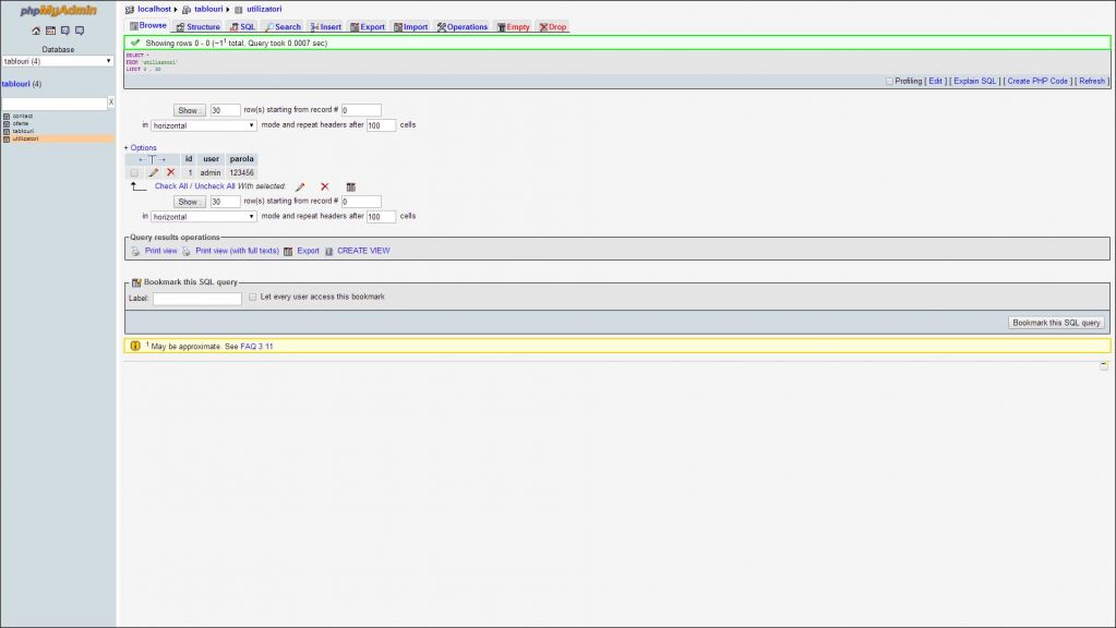 Proiectul a fost realizat cu PHP si MYSQL. Baza de date este alcatuita din 4 tabele a caror structura este prezentata mai jos.